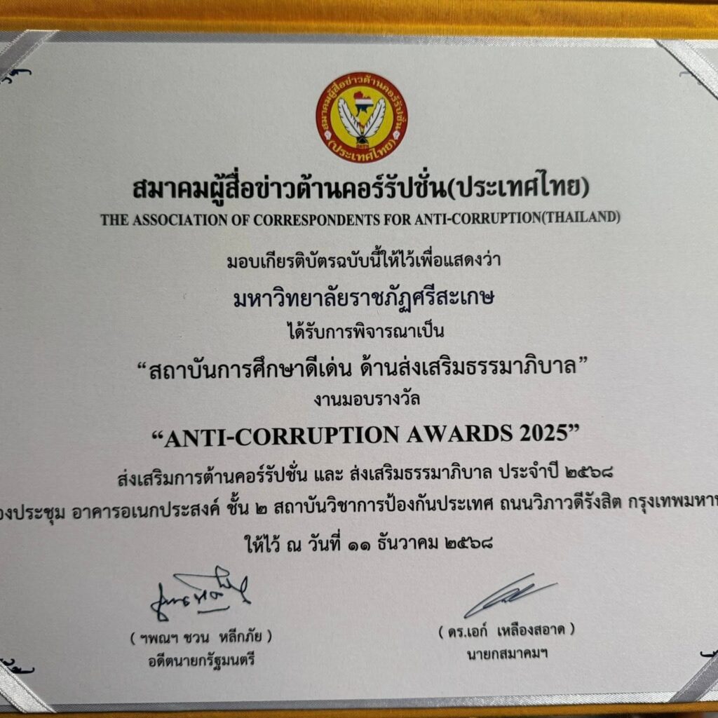 มหาวิทยาลัยราชภัฏศรีสะเกษ เข้ารับรางวัล “สถาบันการศึกษาดีเด่น ด้านส่งเสริมธรรมาภิบาล” (Anti-Corruption Awards 2025)