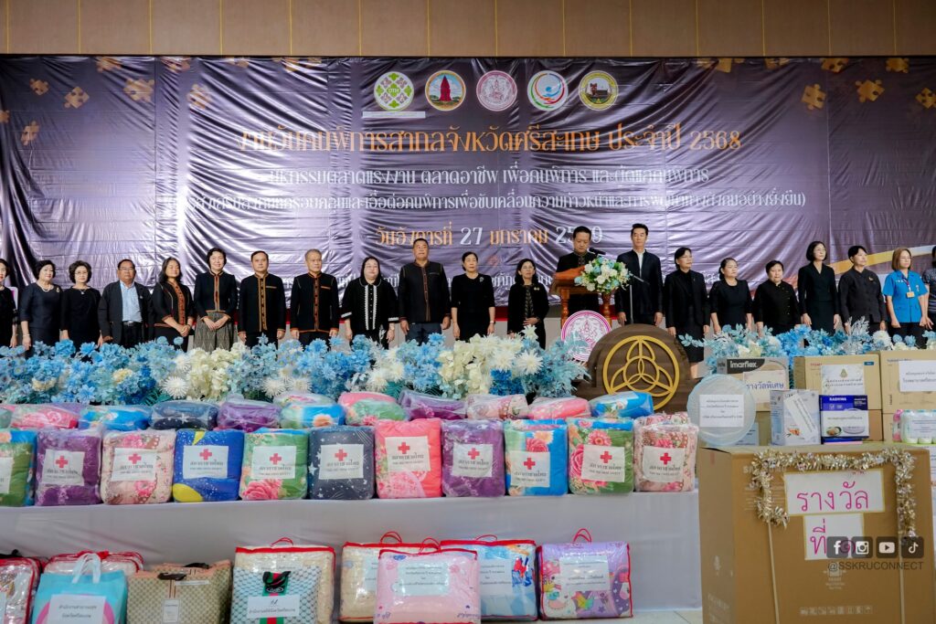 วันที่ 27 มกราคม 2569 ตั้งแต่เวลา 08.00-16.00 น. ณ อาคารหอประชุมทีปังกรรัศมีโชติ มหาวิทยาลัยราชภัฏศรีสะเกษ นายอนุรัตน์ ธรรมประจำจิต ผู้ว่าราชการจังหวัดศรีสะเกษ เป็นประธานในพิธีเปิดวันคนพิการสากลจังหวัดศรีสะเกษ ประจำปี 2568 โดยมหาวิทยาลัยราชภัฏศรีสะเกษ รองศาสตราจารย์ ดร.ประกาศิต อานุภาพแสนยากร อธิการบดีมหาวิทยาลัยราชภัฏศรีสะเกษ มอบหมายให้ รองศาสตราจารย์ ดร.เอมอร แสนภูวา รองอธิการบดีฝ่ายวิจัยและประกันคุณภาพการศึกษาฯ ร่วมพิธีเปิดวันคนพิการสากลจังหวัดศรีสะเกษ ประจำปี 2568 โดยจังหวัดศรีสะเกษ สำนักงานพัฒนาสังคมและความมั่นคงของมนุษย์จังหวัด ได้กำหนด จัดงานวันคนพิการสากลจังหวัดศรีสะเกษ ประจำปี 2568 โดยกลุ่มเป้าหมายเข้าร่วมกิจกรรม ประกอบด้วย คนพิการ ครอบครัวคนพิการ ผู้ดูแลคนพิการ อาสาสมัครและเครือข่ายด้านคนพิการ ผู้แทนจากหน่วยงานภาครัฐและภาคเอกชนที่เกี่ยวข้อง และองค์กรปกครองส่วนท้องถิ่น ประชาชนผู้สนใจทั่วไปและภาคีเครือข่ายทุกภาคส่วนเข้าร่วมกิจกรรมในครั้งนี้