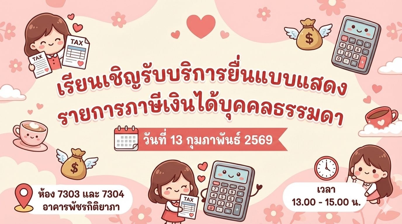 โครงการบูรณาการการเรียนรู้กับการบริการวิชาการด้านภาษีอากร : การให้บริการยื่นแบบภาษีเงินได้บุคคลธรรมดา Start Time 13:00 น. 13 February 2026 Finish Time 15:00 น. 13 February 2026 Address ณ อาคารพัชรกิติยาภา (ตึก7) Share: